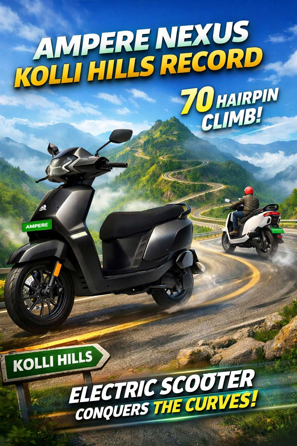 Ampere Nexus grabbed headlines after a timed climb at Kolli Hills in Tamil Nadu. The route is famous for its 70 tight hairpin turns, and that makes it a strong stress test for any scooter. Reports state the run started at 7:00 AM on January 7, 2026, from Belukurichi and finished in 22 minutes and 10 seconds at the summit stretch. The attempt was reported as validated by Asia Book of Records on the same day.