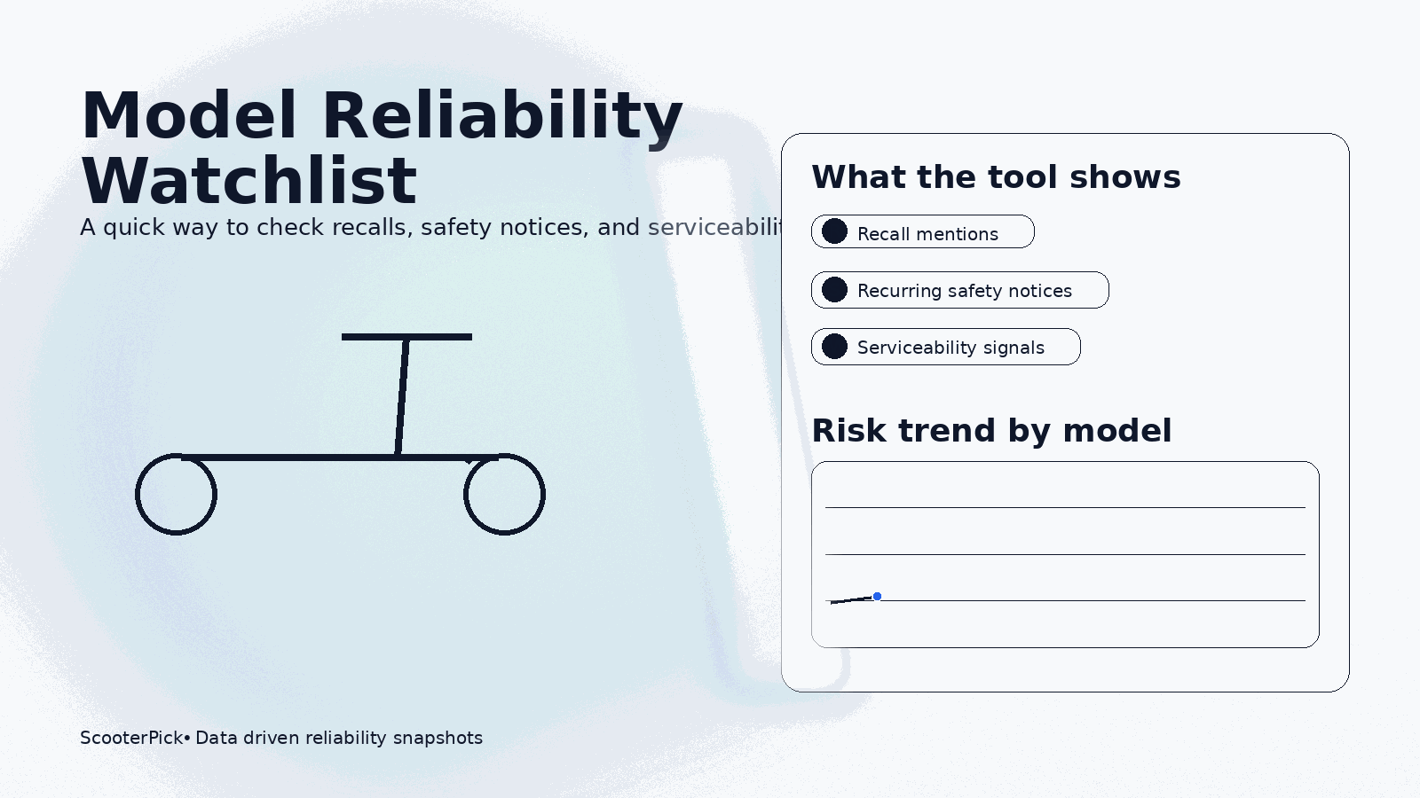 This tool helps you look up a specific model and see three things in one place. Recall mentions, recurring safety notices, and serviceability signals like repair or parts issues.