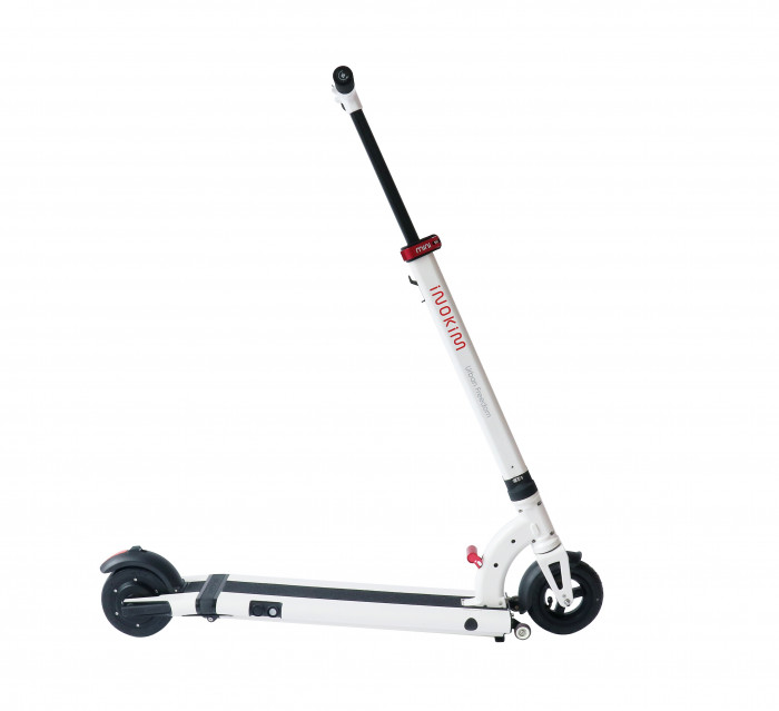This scooter sits at the ultra-portable end of INOKIM’s range. It runs a 36 V system and a 250 W rear hub motor. The deck is slim and the frame uses aircraft-grade aluminum. It folds fast, then stands on small trolley wheels for stations and hallways. The front tire is air-filled, but the rear tire is solid. That mix keeps flats rare at the back and softens the front contact patch.