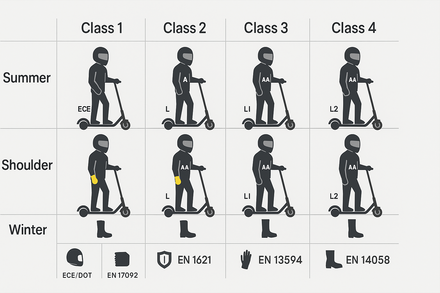 For a concrete Class 2 commuter example, see the Segway Ninebot F2, then use the Season × Speed Class matrices to dial in your kit.